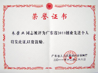 我集團(tuán)執(zhí)行總裁朱榮業(yè)先生等廣東省內(nèi)100名創(chuàng)業(yè)先進(jìn)個(gè)人榮獲“廣東省2011創(chuàng)業(yè)先進(jìn)個(gè)人”榮譽(yù)稱號(hào)。