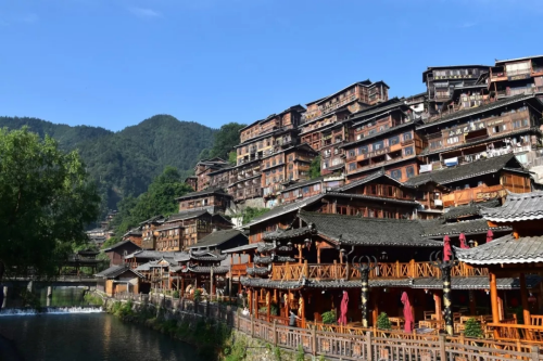 向“黔”進(jìn),必進(jìn)鎮(zhèn)遠(yuǎn)。舞陽(yáng)河呈S型穿城而過,將鎮(zhèn)遠(yuǎn)古城一分為二,府衛(wèi)城各有故事,各有精彩。自古是軍事及商業(yè)要塞的鎮(zhèn)遠(yuǎn),與很多古鎮(zhèn)不同,臨街的樓房雖是新式樓房,但仍然保留著古典“徽派”的建筑風(fēng)格。順著老街的小巷觀賞古鎮(zhèn)的古老建筑,一定要見識(shí)下傳說中的“歪門斜道”。這里的民居大門的朝向都是歪的,不與街道巷道平行,而且巷道也是七扭八拐的。這特別的建筑風(fēng)格據(jù)說是來自風(fēng)水師的告誡,目的是為了藏風(fēng)聚氣。也似乎讓鎮(zhèn)遠(yuǎn)古鎮(zhèn)更有歷史韻味,讓人嘆為觀止。